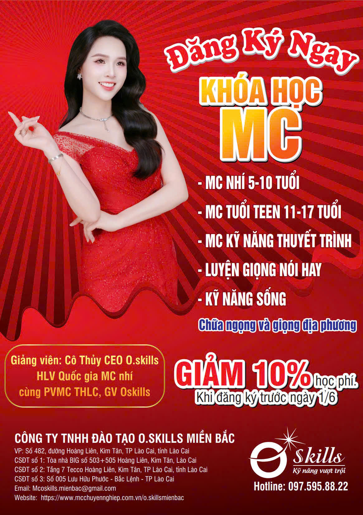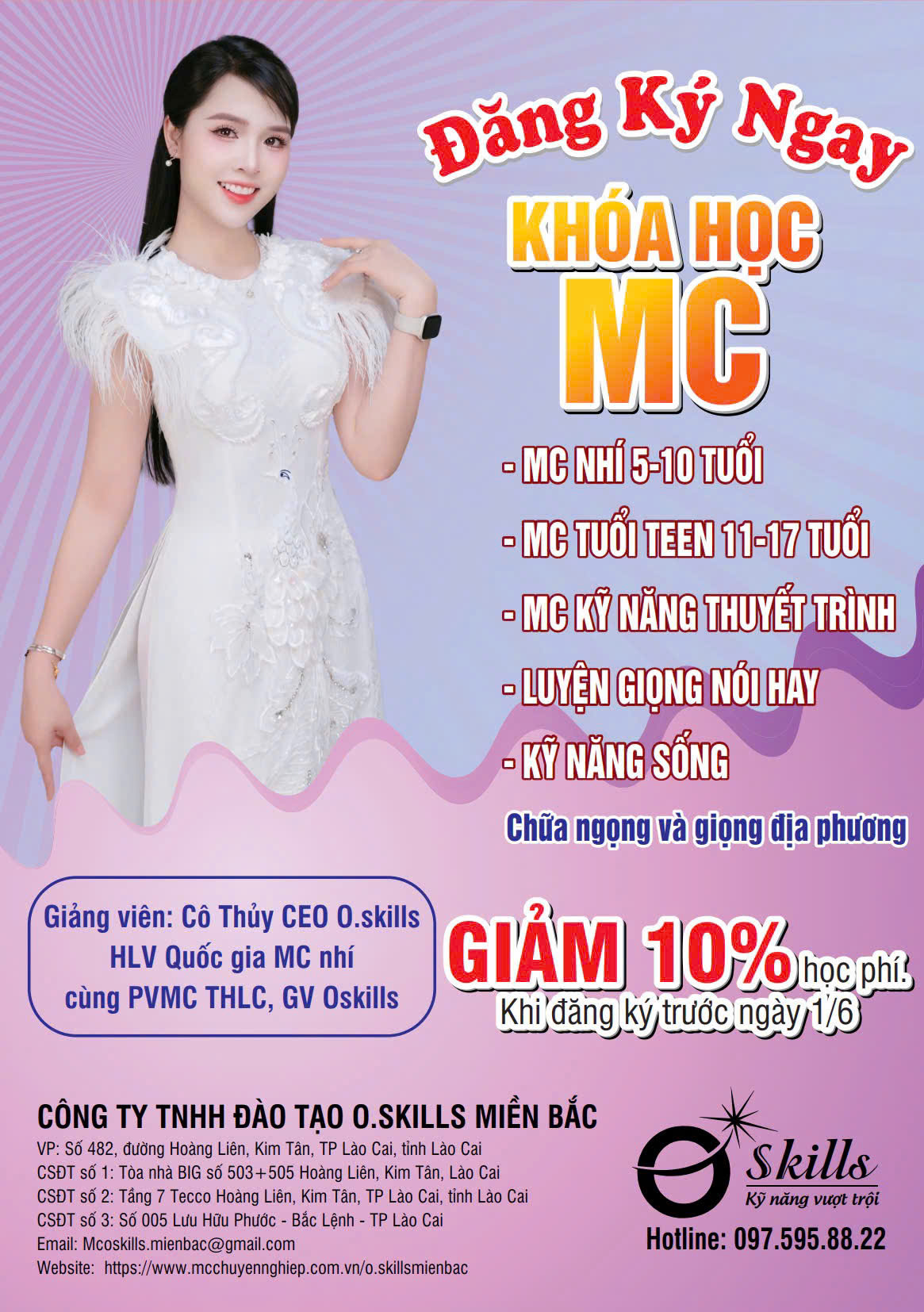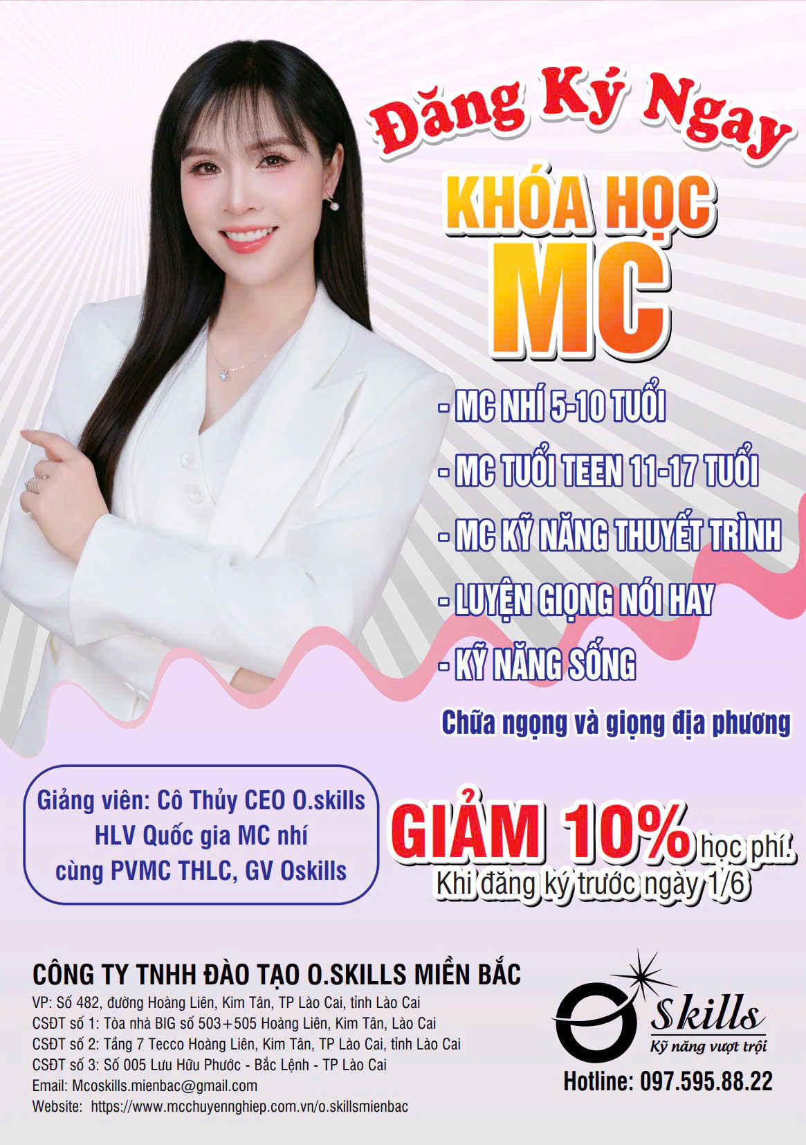 Tưng bừng chào hè 2025 với các khóa học MC – Kỹ năng sống- Chỉnh ngọng và giọng địa phương mọi độ tuổi Ngày đăng: 28/05/2025 Bài viết liên quan - LỊCH NGHỈ TẾT DƯƠNG LỊCH NĂM 2023 - LỊCH HỌC THÁNG 1/ 2024 - LỊCH ĐÀO TẠO MC VÀ CHỈNH NGỌNG, LUYỆN GIỌNG NÓI VÀNG - LỊCH HỌC THÁNG 11 - LỊCH HỌC THÁNG 10